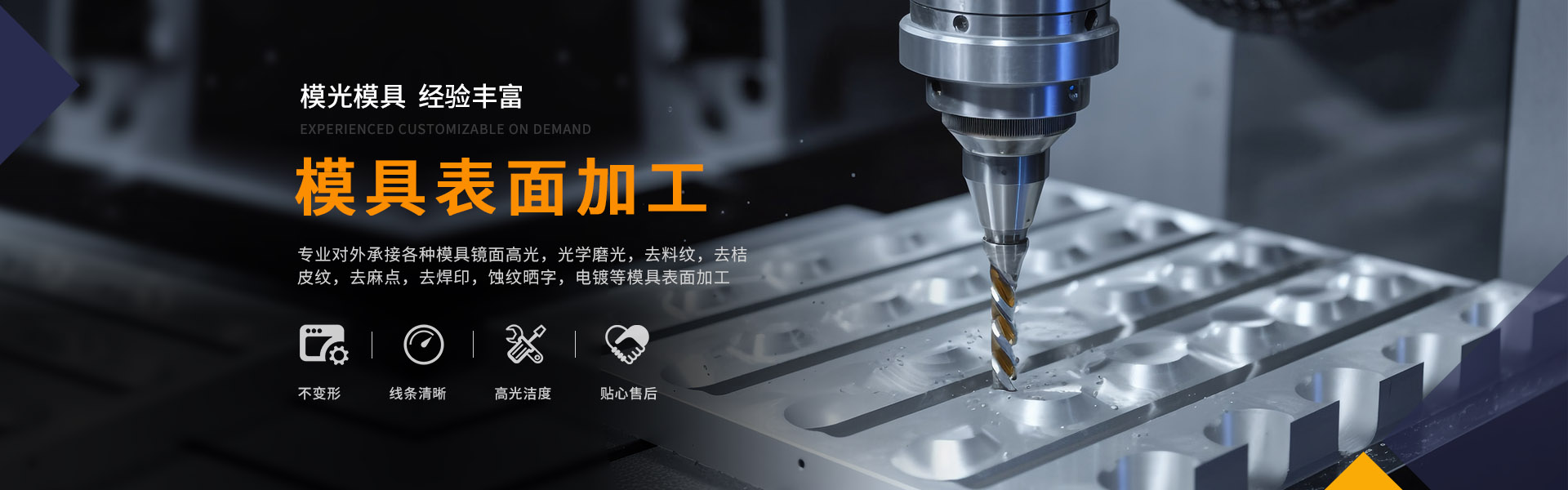 東莞模光模具科技有限公司是一家專業(yè)對外承接各種模具鏡面高光,光學(xué)磨光,去料紋,去桔皮紋,去麻點(diǎn),去焊印,蝕紋曬字,電鍍等模具表面加工。
